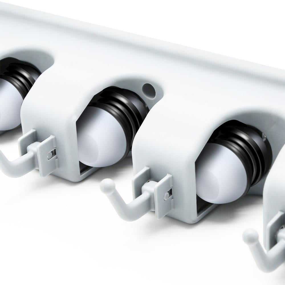 4 position and 5 Hooks holder Use in the laundry, garage, garden, utility room, office and more Wall organizer holds household stick goods with handles of varying thicknesses Insert handle into slot and the gravity controlled rolling ball automatically ajusts to the handle's thickness and holds it securely.